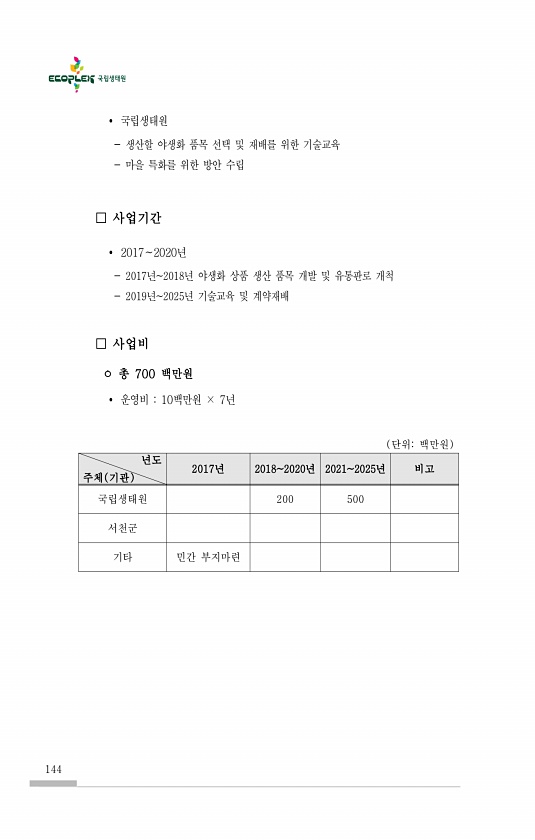 144 ? 국립생태원 생산할 야생화 품목 선택 및 재배를 위한 기술교육 마을 특화를 위한 방안 수립 □ 사업기간 ? 2017∼2020년 2017년2018년 야생화 상품 생산 품목 개발 및 유통판로 개척 2019년2025년 기술교육 및 계약재배 □ 사업비 ? 총 700 백만원 ? 운영비 10백만원 × 7년 단위백만원 년도 주체 기관 2017년 20182020년 20212025년 비고 국립생태원 200 500 서천군 기타 민간부지마련