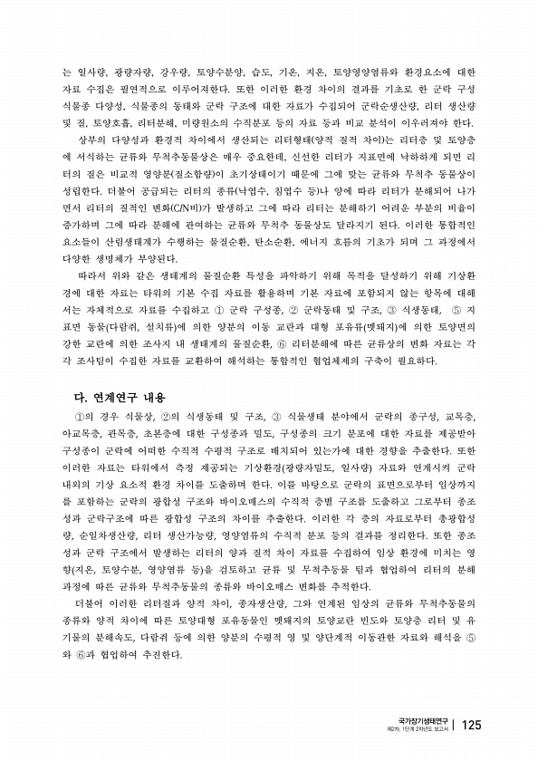 는 일사량, 광량자량, 강우량, 토양수분양, 습도, 기온, 지온, 토양영양염류와 환경요소에 대한 자료 수집은 필연적으로 이루어져한다. 또한 이러한 환경 차이의 결과를 기초로 한 군락 구성 식물종 다양성, 식물종의 동태와 군락 구조에 대한 자료가 수집되어 군락순생산량, 리터 생산량 및 질, 토양호흡, 리터분해, 미량원소의 수직분포 등의 자료 등과 비교 분석이 이우러져야 한다. 상부의 다양성과 환경적 차이에서 생산되는 리터형태 양적 질적 차이 는 리터층 및 토양층 에 서식하는 균류와 무척추동물상은 매우 중요한데, 신선한 리터가 지표면에 낙하하게 되면 리 터의 질은 비교적 영양분 질소함량 이 초기상태이기 때문에 그에 맞는 균류와 무척추 동물상이 성립한다. 더불어 공급되는 리터의 종류 낙엽수, 침엽수 등 나 양에 ...