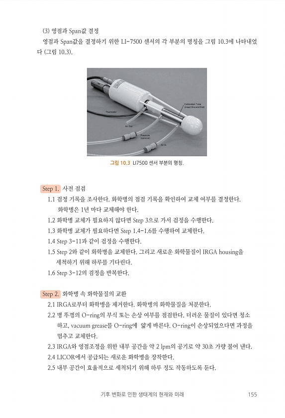기후 변화로 인한 생태계의 현재와 미래 155 3 영점과 Span값 결정 영점과 Span값을 결정하기 위한 LI-7500 센서의 각 부분의 명칭을 그림 10.3에 나타내었 다 그림 10.3 Step 1. 사전 점검 1.1 검정 기록을 조사한다. 화학병의 점검 기록을 확인하여 교체 여부를 결정한다. 화학병은 1년 마다 교체해야 한다. 1.2 화학병 교체가 필요하지 않다면 Step 3으로 가서 검정을 수행한다. 1.3 화학병 교체가 필요하다면 Step 1.4-1.6를 수행하여 교체한다. 1.4 Step 3-11과 같이 검정을 수행한다. 1.5 Step 2와 같이 화학병을 교체한다. 그리고 새로운 화학물질이 IRGA housing을 세척하기 위해 하루를 기다린다. 1.6 Step 3-12의 검정을 반복한다. St...