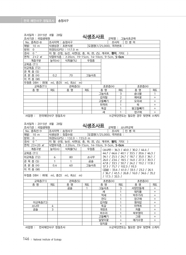 전국 해안사구 정밀조사 송정사구 146 ? National Institute of Ecology 조사일자 2015년 8월 28일 조사기관 국립생태원 식생조사표 군락명 그늘사초군락 No. 중측선-8 조사지역 송정사구 조사자 민 병 미 해발10 m 식생상관 초본식생 도엽명 1/25,000 , 격자번호 방위0 위경도 GPS 117.0 m 경사0 ° 지 형산정, 능선, 사면 상, 중, 하, 凹, 凸 , 계곡부, 평지, 기타 면적2×2 ㎡ 낙엽부식층 ≥20cm, 19-15cm, 14-10cm, 9-5cm, 5-0cm 계층구분 높이 m 식피율 % 우점종 교목층 T1 아교목층 T2 관 목 층 S 초 본 층 H 0.2 70 그늘사초 이 끼 층 M 우점종 DBH 최대 m , 중간 m , 최소 m 교목층 T1 관목층 S 초본...