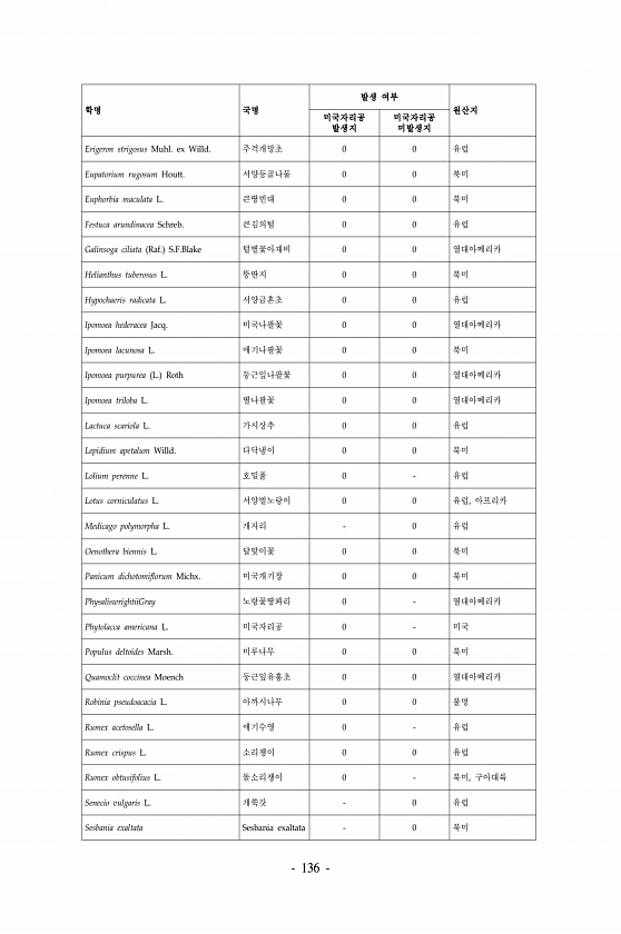 136 학명 국명 발생 여부 원산지 미국자리공 발생지 미국자리공 미발생지 Erigeron strigosus Muhl. ex Willd. 주걱개망초 0 0 유럽 Eupatorium rugosum Houtt. 서양등골나물 0 0 북미 Euphorbia maculata L. 큰땅빈대 0 0 북미 Festuca arundinacea Schreb. 큰김의털 0 0 유럽 Galinsoga ciliata Raf. S.F.Blake 털별꽃아재비 0 0 열대아메리카 Helianthus tuberosus L. 뚱딴지 0 0 북미 Hypochaeris radicata L. 서양금혼초 0 0 유럽 Ipomoea hederacea Jacq. 미국나팔꽃 0 0 열대아메리카 Ipomoea lacunosa L. 애기나팔꽃 0 0 북미 ...
