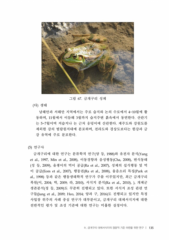 그림 금개구리 성체 다 생태 남해안과 서해안 지역에서는 주로 습지와 논의 수로에서 월에 활 동하며 월에서 이듬해 월까지 습지주변 흙속에서 동면한다 산란기 는 월이며 저습지나 논 근처 웅덩이에 산란한다 제주도와 강원도를 제외한 강의 범람원지대에 분포하며 전라도와 경상도보다는 한강과 금 강 유역에 주로 분포한다 연구사 금개구리에 대한 연구는 분류학적 연구 양 등 와 유전자 분석 이동경향과 음성행동 번식동태 성 등 올챙이의 먹이 공급 성체의 섭식행동 및 먹 이 공급 행동권 울음소리 특징 등과 같은 행동생태학적 연구가 주를 이루었지만 최근 금개구리 복원 이 박 라 서식지 분석 개체군 생존분석 정 등 도 꾸준히 진행되고 있다 또한 서식지 조성 관련 연 구들 양과 구 도 진행되고 있지만 특정 사업장 위주의 사례 중심 ...