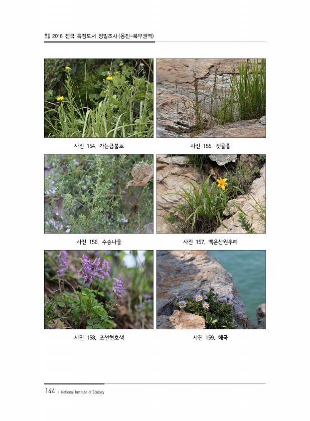 2016 전국 특정도서 정밀조사 옹진-북부권역 144 ? National Institute of Ecology 사진 154. 가는금불초 사진 155. 갯골풀 사진 156. 수송나물 사진 157. 백운산원추리 사진 158. 조선현호색 사진 159.해국