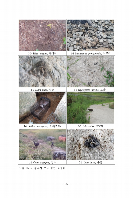 1-3 Talpa wogura, 두더지 1-1 Nyctereutes procyonoides, 너구리 1-2 Lutra lutra, 수달 1-1 Hydropotes inermis, 고라니 1-2 Rattus norvegicus, 집쥐 포획 1-1 Felis catus, 고양이 1-1 Capra aegagrus, 염소 2-1 Lutra lutra, 수달 그림 Ⅲ- 5. 광역시 주요 출현 포유류 132