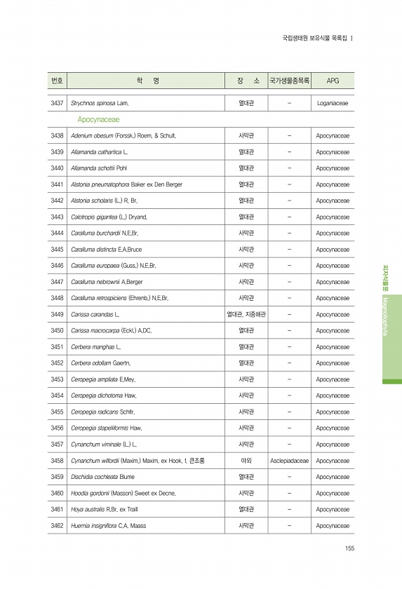 155 번호 학 명 장 소 국가생물종목록 APG 피자식물문 Magnoliophyta 국립생태원 보유식물 목록집 Ⅰ 3437 Strychnos spinosa Lam. 열대관 Loganiaceae Apocynaceae 3438 Adenium obesum Forssk. Roem. & Schult. 사막관 Apocynaceae 3439 Allamanda cathartica L. 열대관 Apocynaceae 3440 Allamanda schottii Pohl 열대관 Apocynaceae 3441 Alstonia pneumatophora Baker ex Den Berger 열대관 Apocynaceae 3442 Alstonia scholaris L. R. Br. 열대관 Apocynaceae 3443 Calotropis ...