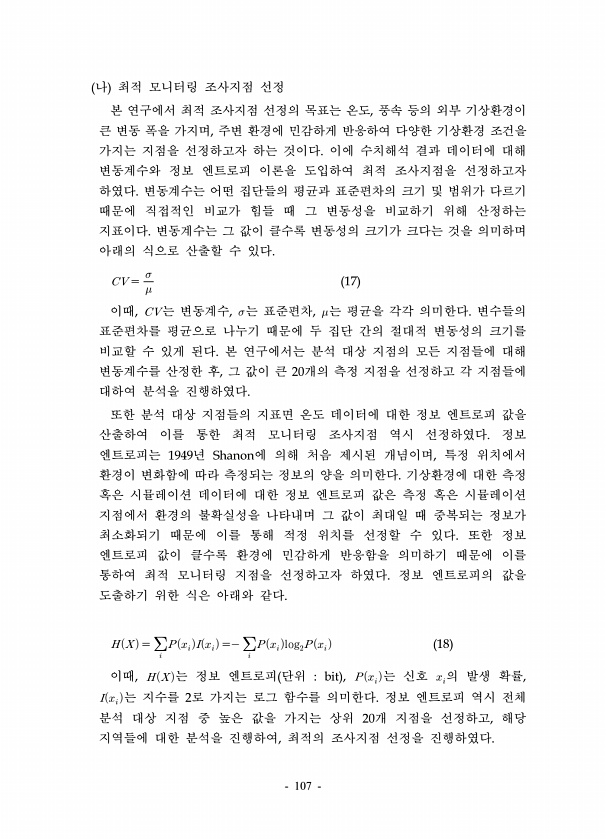 107 나 최적 모니터링 조사지점 선정 본 연구에서 최적 조사지점 선정의 목표는 온도, 풍속 등의 외부 기상환경이 큰 변동 폭을 가지며, 주변 환경에 민감하게 반응하여 다양한 기상환경 조건을 가지는 지점을 선정하고자 하는 것이다. 이에 수치해석 결과 데이터에 대해 변동계수와 정보 엔트로피 이론을 도입하여 최적 조사지점을 선정하고자 하였다. 변동계수는 어떤 집단들의 평균과 표준편차의 크기 및 범위가 다르기 때문에 직접적인 비교가 힘들 때 그 변동성을 비교하기 위해 산정하는 지표이다. 변동계수는 그 값이 클수록 변동성의 크기가 크다는 것을 의미하며 아래의 식으로 산출할 수 있다. 17 이때, 는 변동계수, 는 표준편차, 는 평균을 각각 의미한다. 변수들의 표준편차를 평균으로 나누기 때...