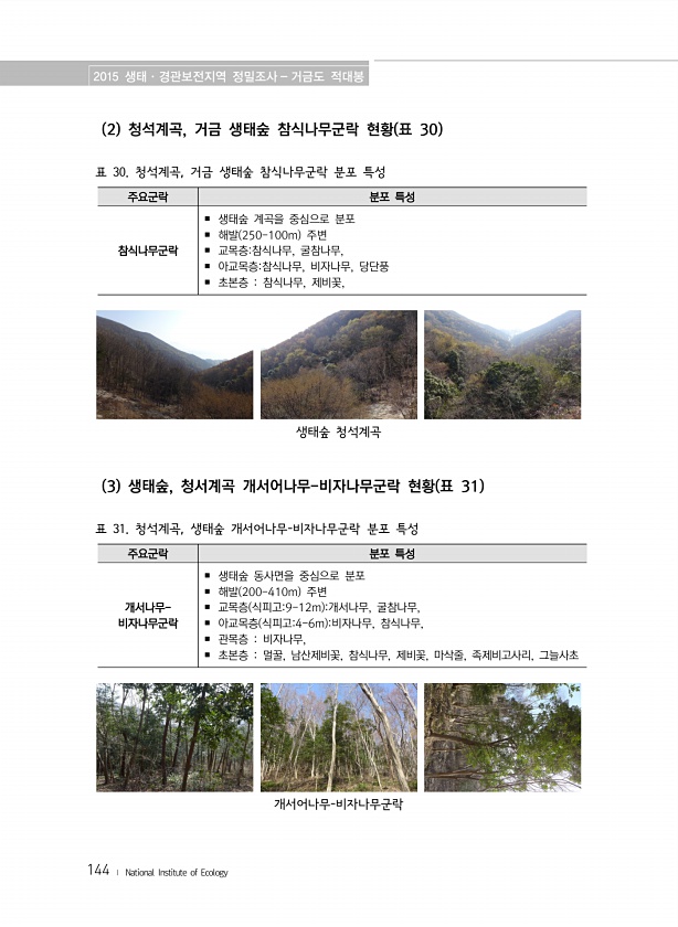 2015 생태·경관보전지역 정밀조사 거금도 적대봉 144 ? National Institute of Ecology 개서어나무-비자나무군락 2 청석계곡, 거금 생태숲 참식나무군락 현황 표 30 표 30. 청석계곡, 거금 생태숲 참식나무군락 분포 특성 주요군락 분포 특성 참식나무군락 ? 생태숲 계곡을 중심으로 분포 ? 해발 250-100m 주변 ? 교목층참식나무, 굴참나무, ? 아교목층참식나무, 비자나무, 당단풍 ? 초본층 참식나무, 제비꽃, 생태숲 청석계곡 3 생태숲, 청서계곡 개서어나무-비자나무군락 현황 표 31 표 31. 청석계곡, 생태숲 개서어나무-비자나무군락 분포 특성 주요군락 분포 특성 개서나무- 비자나무군락 ? 생태숲 동사면을 중심으로 분포 ? 해발 200-410m 주변 ? 교목층 식피고9-12m ...