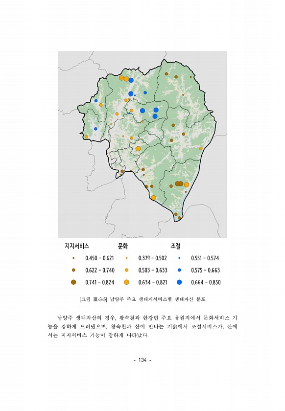 134 [그림 Ⅲ-3-5] 남양주 주요 생태계서비스별 생태자산 분포 남양주 생태자산의 경우, 왕숙천과 한강변 주요 유원지에서 문화서비스 기 능을 강하게 드러냈으며, 왕숙천과 산이 만나는 기슭에서 조절서비스가, 산에 서는 지지서비스 기능이 강하게나타났다.