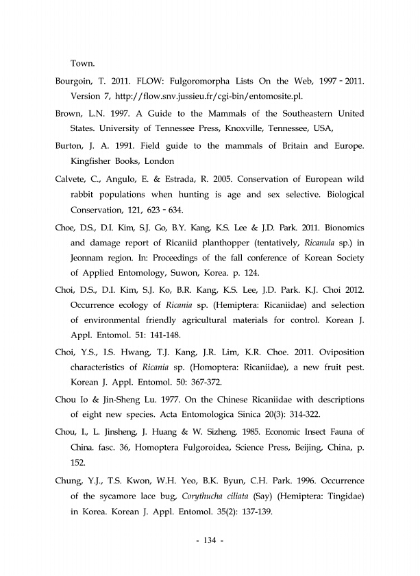134 Town. Bourgoin, T. 2011. FLOWFulgoromorpha Lists On the Web, 1997?2011. Version 7, http//flow.snv.jussieu.fr/cgi-bin/entomosite.pl. Brown, L.N. 1997. A Guide to the Mammals of the Southeastern United States. University of Tennessee Press, Knoxville, Tennessee, USA, Burton, J. A. 1991. Field guide to the mammals of Britain and Europe. Kingfisher Books, London Calvete, C., Angulo, E. & Estrada, ...