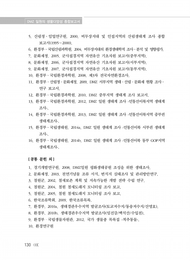DMZ 일원의 생물다양성 종합보고서 130 5. 산림청·임업연구원. 2000. 비무장지대 및 인접지역의 산림생태계 조사 종합 보고서 1995∼2000 6. 환경부·국립산림과학원. 2004. 비무장지대의 환경생태학적 조사·분석 및 영향평가. 7. 문화재청. 2005. 군사접경지역 자연유산 기초자원 보고서 중부지역 8. 문화재청. 2006. 군사접경지역 자연유산 기초자원 보고서 서부지역 9. 문화재청. 2007. 군사접경지역 자연유산 기초자원 보고서 동부지역 10. 환경부·국립환경과학원. 2008. 제3차 전국자연환경조사. 11. 환경부·산림청·문화재청. 2009. DMZ 서부지역 생태·산림·문화재 현황 조사· 연구 보고서. 12. 환경부·국립환경과학원. 2010. DMZ 중부지역 생태계 조사 보고서. 13. ...