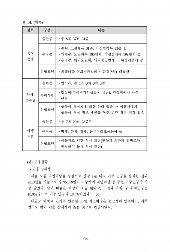 표 54. 계속 항목 구분 내용 육상 곤충 출현종 ?총 8목 37과 94종 우점종 ?종수노린재목 31종, 딱정벌레목 22종 등 ?개체수노린재목 385개체, 딱정벌레목 199개체 등 ?우점종애기노린재, 돼지풀잎벌레, 국화방패벌레 등 위협요인 ?외래해충 국화방패벌레 여름철 8월 대발생 양서· 파충류 출현종 ?양서류총 1목 3과 3속 3종 특이사항 ?맹꽁이 멸종위기야생동물 Ⅱ급 , 건습지에서 유생 관찰 위협요인 ?맹꽁이 서식지에 대한 안내 없음 → 이용자에게 맹꽁이 서식 정보 제공을 통한 교란 위험 저감 필요 야생 조류 출현종 ?총 7목 20과 28종류 우점종 ?박새, 까치, 참새, 붉은머리오목눈이 등 위협요인 ?이용자로 인한 서식 교란 연못과 계류가 탐방로와 인접하여 물새 서식 교란 다 이용현황 1 이용 잠재성...