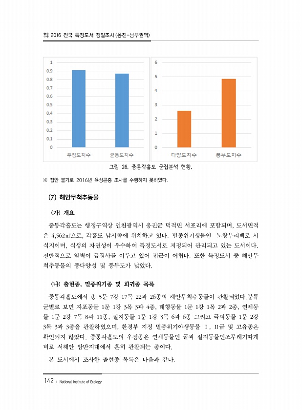 2016 전국 특정도서 정밀조사 옹진-남부권역 142 ? National Institute of Ecology 그림 26. 중통각흘도 군집분석 현황. ※ 접안 불가로 2016년 육상곤충 조사를 수행하지 못하였다. 7 해안무척추동물 가 개요 중통각흘도는 행정구역상 인천광역시 옹진군 덕적면 서포리에 포함되며, 도서면적 은 4,562㎡으로, 각흘도 남서쪽에 위치하고 있다. 멸종위기생물인 노랑부리백로 서 식지이며, 식생의 자연성이 우수하여 특정도서로 지정되어 관리되고 있는 도서이다. 전반적으로 암벽이 급경사를 이루고 있어 접근이 어렵다. 또한 특정도서 중 해안무 척추동물의 종다양성 및 풍부도가 낮았다. 나 출현종, 멸종위기종 및 희귀종 목록 중통각흘도에서 총 5문 7강 17목 22과 26종의 해안무척추동물이 관찰되...