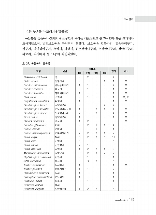 Ⅱ. 조사결과 www.nie.re.kr ? 145 나 늦은목이도래기재 옥돌봉 옥돌봉은 늦은목이도래기재 소구간에 속하는 대표산으로 총 7목 15과 29종 91개체가 조사되었으며, 법정보호종은 확인되지 않았다. 보호종은 말똥가리, 검은등뻐꾸기, 뻐꾸기, 벙어리뻐꾸기, 소쩍새, 파랑새, 큰오색딱다구리, 오색딱다구리, 청딱다구리, 꾀꼬리, 되지빠귀 등 11종이 확인되었다. 표 37. 옥돌봉의 종목록 학명 국명 개체수 합계 비고 1차 2차 3차 4차 Phasianus colchicus 꿩 2 2 Buteo buteo 말똥가리 1 1 보 Cuculus micropterus 검은등뻐꾸기 1 1 2 보 Cuculus canorus 뻐꾸기 1 1 보 Cuculus saturatus...