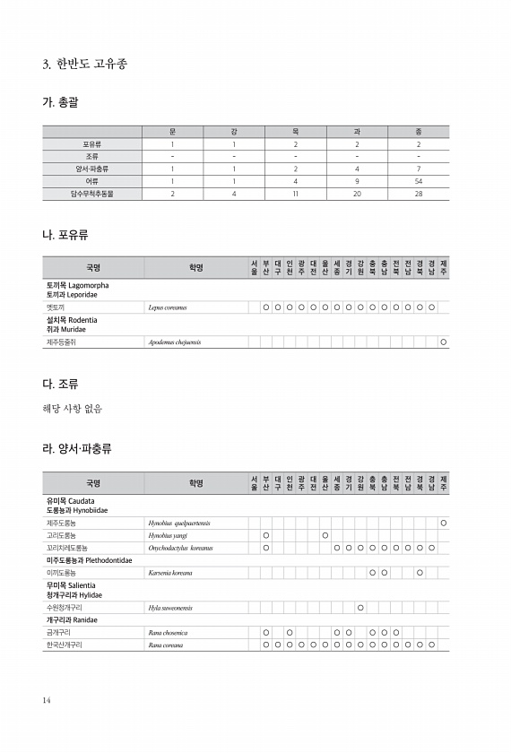 14 3. 한반도 고유종 가. 총괄 문 강 목 과 종 포유류 1 1 2 2 2 조류 양서·파충류 1 1 2 4 7 어류 1 1 4 9 54 담수무척추동물 2 4 11 20 28 나. 포유류 국명 학명 서 울 부산 대구 인천 광주 대전 울산 세종 경기 강원 충북 충남 전북 전남 경북 경남 제주 토끼목 Lagomorpha 토끼과 Leporidae 멧토끼 Lepus coreanus ○ ○ ○ ○ ○ ○ ○ ○ ○ ○ ○ ○ ○ ○ ○ 설치목 Rodentia 쥐과 Muridae 제주등줄쥐 Apodemus chejuensis ○ 다. 조류 해당 사항 없음 라. 양서·파충류 국명 학명 서 울 부산 대구 인천 광주 대전 울산 세종 경기 강원 충북 충남 전북 전남 경북 경남 제주 유미목 Caudata 도롱뇽과 Hynobi...