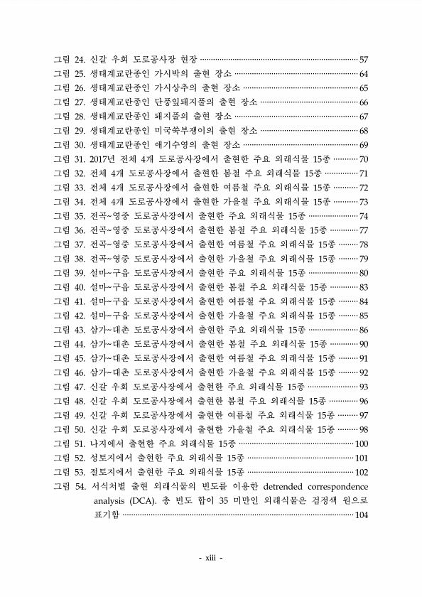 그림 신갈 우회 도로공사장 현장 그림 생태계교란종인 가시박의 출현 장소 그림 생태계교란종인 가시상추의 출현 장소 그림 생태계교란종인 단풍잎돼지풀의 출현 장소 그림 생태계교란종인 돼지풀의 출현 장소 그림 생태계교란종인 미국쑥부쟁이의 출현 장소 그림 생태계교란종인 애기수영의 출현 장소 그림 년 전체 개 도로공사장에서 출현한 주요 외래식물 종 그림 전체 개 도로공사장에서 출현한 봄철 주요 외래식물 종 그림 전체 개 도로공사장에서 출현한 여름철 주요 외래식물 종 그림 전체 개 도로공사장에서 출현한 가을철 주요 외래식물 종 그림 전곡 영중 도로공사장에서 출현한 주요 외래식물 종 그림 전곡 영중 도로공사장에서 출현한 봄철 주요 외래식물 종 그림 전곡 영중 도로공사장에서 출현한 여름철 주요 외래식물 종 그림 전곡 영중 ...