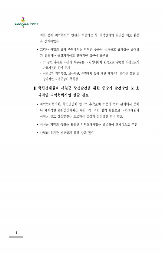 4 최를 통해 지역주민의 민원을 수렴하는 등 지역민과의 친밀감 제고 활동 을 전개하였음 ? 그러나 사업의 효과 측면에서는 미진한 부분이 존재하고 효과성을 증대하 기 위해서는 중장기적이고 전략적인 접근이 요구됨 그 동안 추진된 사업의 대부분은 국립생태원이 단독으로 수행한 사업들로서 가용자원의 한계 존재 서천군의 지역특성, 보유자원, 추진계획 등에 대한 체계적인 분석을 통한 중 장기적인 사업구상이 부족함 ? 국립생태원과 서천군 상생발전을 위한 중장기 발전방안 및 효 과적인 지역협력사업 발굴 필요 ? 지역협력협의회, 주민간담회 형식의 후속조치 수준의 협력 관계에서 벗어 나 체계적인 종합발전계획을 수립, 적극적인 협력 활동으로 국립생태원과 서천군 상호 상생발전을 도모하는 중장기 발전방안 연구 필요 ? 서천군...