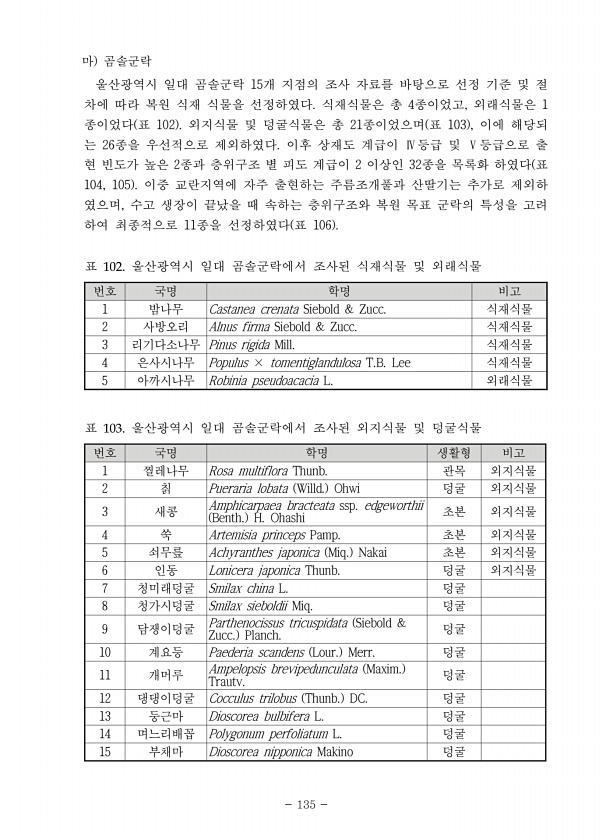 전국 해안사구 정밀조사 맹방사구 146 ? National Institute of Ecology 번호 학 명 국 명 해안 및 사구지역 내륙지역 비고 1 2 3 4 5 6 7 8 9 62 Lathyrus japonicus var. aleuticus Fernald ex Nakai 털갯완두 ○ ○ ○ ○ ○ ○ 63 Sophora flavescens Solander ex Aiton 고삼 ○ ○ 64 Glycine soja Siebold & Zucc. 돌콩 ○ ○ 국 65 Kummerowia striata Thunb. ex Murray Schindl. 매듭풀 ○ ○ 66 Lespedeza cuneata G.Don 비수리 ○ ○ ○ ○ 67 Amphicarpaea bracteata subsp. edgeworthii ...
