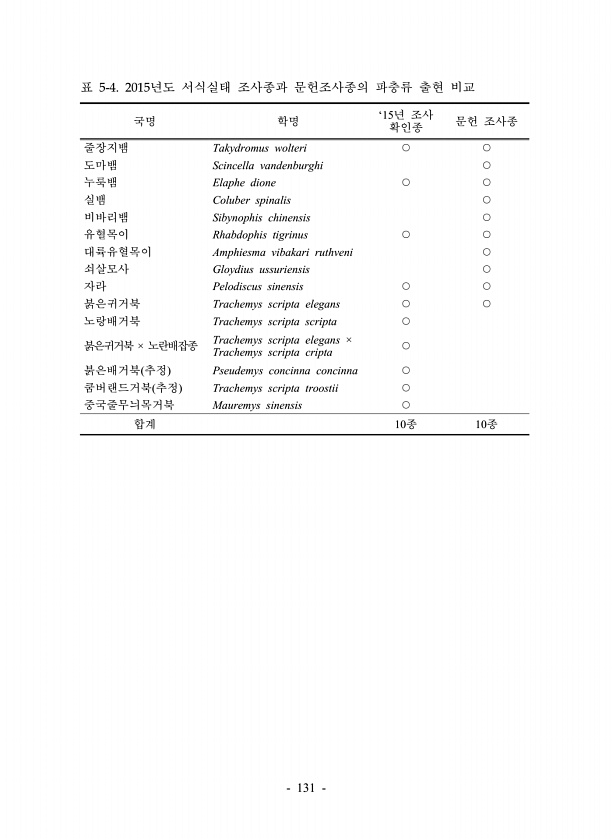 131 국명 학명 ‘15년 조사 확인종 문헌 조사종 줄장지뱀 Takydromus wolteri ○ ○ 도마뱀 Scincella vandenburghi ○ 누룩뱀 Elaphe dione ○ ○ 실뱀 Coluber spinalis ○ 비바리뱀 Sibynophis chinensis ○ 유혈목이 Rhabdophis tigrinus ○ ○ 대륙유혈목이 Amphiesma vibakari ruthveni ○ 쇠살모사 Gloydius ussuriensis ○ 자라 Pelodiscus sinensis ○ ○ 붉은귀거북 Trachemys scripta elegans ○ ○ 노랑배거북 Trachemys scripta scripta ○ 붉은귀거북 × 노란배잡종 Trachemys scripta elegans × Trachemys ...