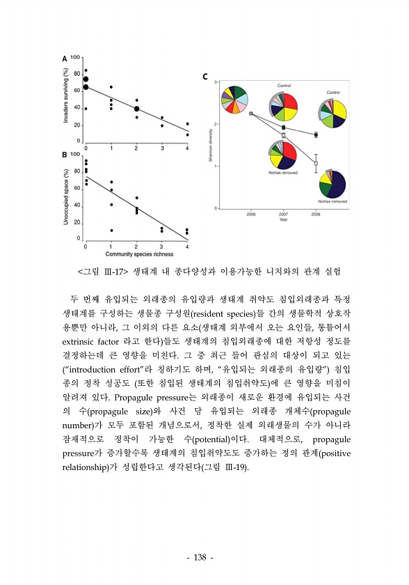 그림 생태계 내 종다양성과 이용가능한 니치와의 관계 실험 두 번째 유입되는 외래종의 유입량과 생태계 취약도 침입외래종과 특정 생태계를 구성하는 생물종 구성원 들 간의 생물학적 상호작 용뿐만 아니라 그 이외의 다른 요소 생태계 외부에서 오는 요인들 통틀어서 라고 한다 들도 생태계의 침입외래종에 대한 저항성 정도를 결정하는데 큰 영향을 미친다 그 중 최근 들어 관심의 대상이 되고 있는 라 칭하기도 하며 유입되는 외래종의 유입량 침입 종의 정착 성공도 또한 침입된 생태계의 침입취약도 에 큰 영향을 미침이 알려져 있다 는 외래종이 새로운 환경에 유입되는 사건 의 수 와 사건 당 유입되는 외래종 개체수 가 모두 포함된 개념으로서 정착한 실제 외래생물의 수가 아니라 잠재적으로 정착이 가능한 수 이다 대체적으로 가 증가...