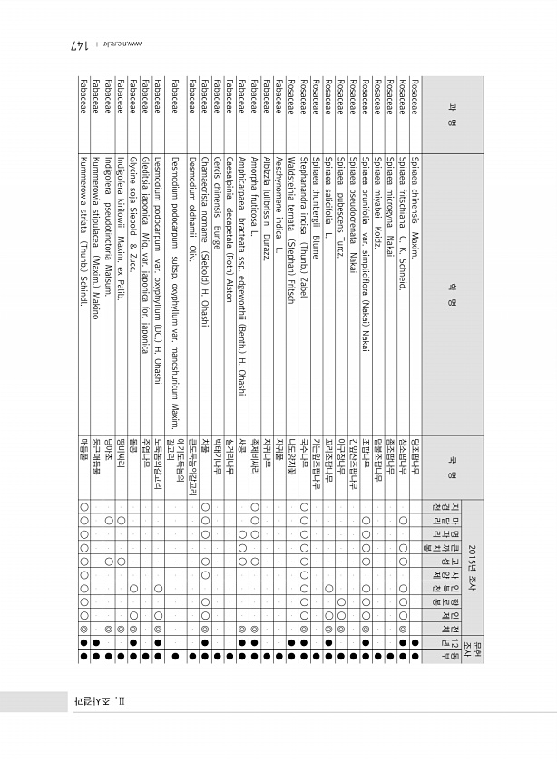 147 과 명 학 명 국 명 2015년 조사 문헌 조사 지경천 마달리 명파리 큰까치봉 고성 사양제 인북천 향로봉 인제 전체 12 년 동부 Rosaceae Spiraea chinensis Maxim. 당조팝나무 ● ● Rosaceae Spiraea fritschiana C. K. Schneid. 참조팝나무 ? ? ? ? ? ? ◎ ● ● Rosaceae Spiraea microgyna Nakai 좀조팝나무 ● Rosaceae Spiraea miyabei Koidz. 덤불조팝나무 ● Rosaceae Spiraea prunifolia var. simpliciflora Nakai Nakai 조팝나무...