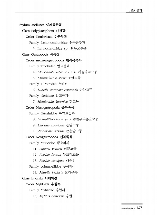 Ⅱ. 조사결과 www.nie.re.kr ? 147 Phylum Mollusca 연체동물문 Class Polyplacophora 다판강 Order Neoloricata 신군부목 Family Ischonochitonidae 연두군부과 3. Ischnochitonidae sp. 연두군부류 Class Gastropoda 복족강 Order Archaeogastropoda 원시복족목 Family Trochidae 밤고둥과 4. Monodonta labio confusa 개울타리고둥 5. Omphalius rusticus 보말고둥 Family Turbinidae 소라과 6. Lunella coronata coreensis 눈알고둥 Family Neritidae 갈고둥과 7. Heminerita japonica 갈고둥 O...