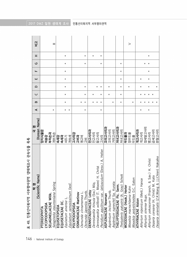 146 표 49. 민통선이북지역 서부평야권역 생태계조사 관속식물 목록 학 명 Scientific Name 국 명 Korean Name A B C D E F G H 비고 PTERIDOPHYTA 양치식물문 LYCOPODIOPSIDA 석송강 SELAGINELLACEAE Willk. 부처손과 Selaginella stauntoniana Spring 개부처손 * Ⅲ EQUISETOPSIDA 속새강 EQUISETACEAE DC. 속새과 Equisetum arvense L. 쇠뜨기 * * * * * * * * Equisetum ramosissimum Desf. 개속새 * POLYPODIOPSIDA 고사리강 OSMUNDACEAE Martinov 고비과 Osmunda cinnamomea L. 꿩고비 * Osmunda jap...