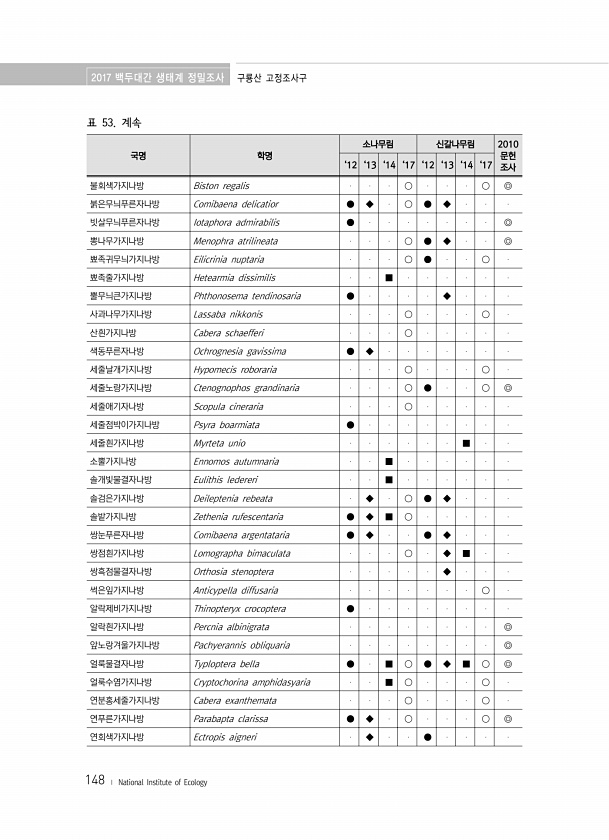 2017 백두대간 생태계 정밀조사 구룡산 고정조사구 148 ? National Institute of Ecology 표 53. 계속 국명 학명 소나무림 신갈나무림 2010 문헌 ‘12 ‘13 ‘14 ‘17 ‘12 ‘13 ‘14 ‘17 조사 불회색가지나방 Biston regalis ○ ○ ◎ 붉은무늬푸른자나방 Comibaena delicatior ● ◆ ○ ● ◆ 빗살무늬푸른자나방 Iotaphora admirabilis ● ◎ 뽕나무가지나방 Menophra atrilineata ○ ● ◆ ◎ 뾰족귀무늬가지나방 Eilicrinia nuptaria ○ ● ○ 뾰족줄가지나방 Hetearmia dissimilis ■ ...
