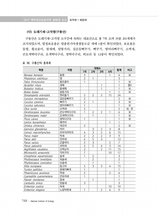 2017 백두대간보호지역 생태계 조사 묘적재 화방재 146 ? National Institute of Ecology 다 도래기재고직령 구룡산 구룡산은 도래기재고직령 소구간에 속하는 대표산으로 총 7목 21과 35종 201개체가 조사되었으며, 법정보호종은 멸종위기야생생물Ⅱ급 새매 1종이 확인되었다. 보호종은 들꿩, 황조롱이, 왕새매, 말똥가리, 검은등뻐꾸기, 뻐꾸기, 벙어리뻐꾸기, 소쩍새, 큰오색딱다구리, 오색딱다구리, 청딱다구리, 꾀꼬리 등 12종이 확인되었다. 표 38. 구룡산의 종목록 학명 국명 개체수 합계 비고 1차 2차 3차 4차 Bonasa bonasia 들꿩 3 1 4 보 Phasianus colchicus 꿩 2 1 3 Falco tinnunculus 황조롱이 1 1...