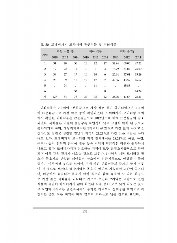 132 지역 확인 식물 종 귀화 식물 귀화 율 % 2010 2012 2014 2010 2012 2014 2010 2012 2014 1 34 20 36 18 12 17 52.94 60.00 47.22 2 19 22 12 3 7 3 15.79 31.82 25.00 3 39 27 17 10 10 6 25.64 37.04 35.29 4 28 39 15 12 17 7 42.86 43.59 46.67 5 24 11 45.83 6 33 8 24.24 계 127 84 78 33 35 22 25.98 41.67 28.21 표 50. 도깨비가지 조사지역 확인식물 및 귀화식물 귀화식물은 2지역이 3분류군으로 가장 적은 종이 확인되었으며, 1지역 이 17분류군으로 가장 많은 종이 확인되었다. 도깨비가지 모니터링 지역 에서 확인된...