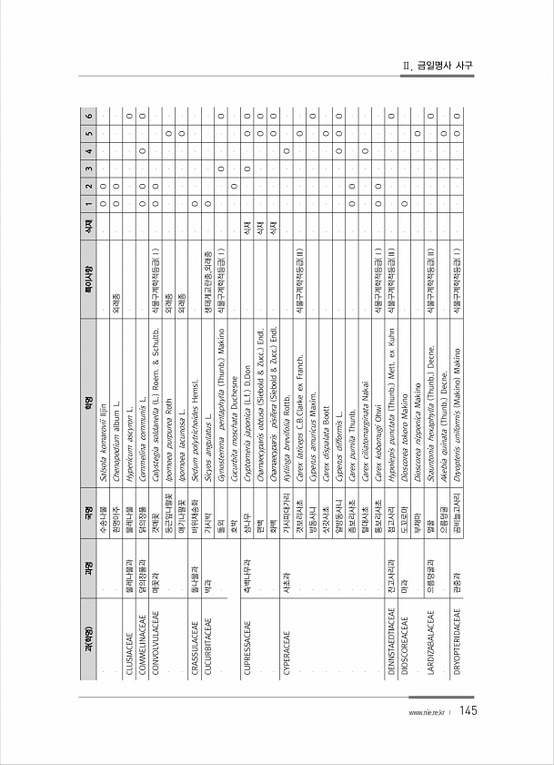 145 과 학명 과명 국명 학명 특이사항 식재 1 2 3 4 5 6 수송나물 Salsola komarovii Iljin O O 흰명아주 Chenopodium album L. 외래종 O O CLUSIACEAE 물레나물과 물레나물 Hypericum ascyron L. O COMMELINACEAE 닭의장풀과 닭의장풀 Commelina communis L. O O O O CONVOLVULACEAE 메꽃과 갯메꽃 Calystegia soldanella L. Roem. & Schultb. 식물구계학적등급 Ⅰ O O 둥근잎나팔꽃 Ipomoea purpurea Roth 외래종 O 애기나팔꽃 ...