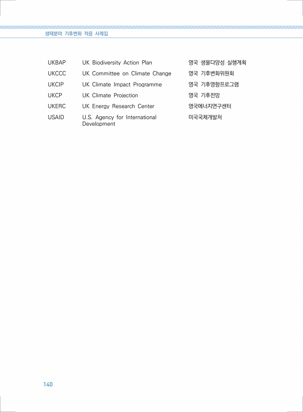생태분야 기후변화 적응 사례집 140 UKBAP UK Biodiversity Action Plan 영국 생물다양성 실행계획 UKCCC UK Committee on Climate Change 영국 기후변화위원회 UKCIP UK Climate Impact Programme 영국 기후영향프로그램 UKCP UK Climate Projection 영국 기후전망 UKERC UK Energy Research Center 영국에너지연구센터 USAID U.S. Agency for International Development미국국제개발처