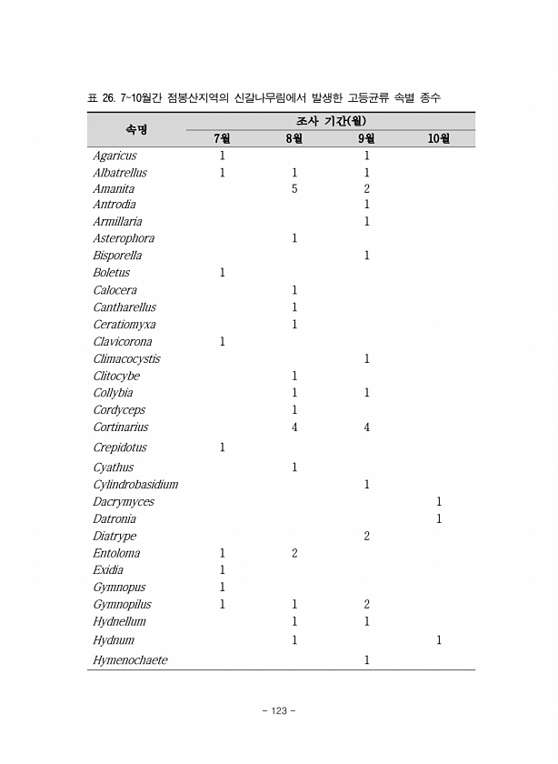속명 조사 기간 월 7월 8월 9월 10월 Agaricus 1 1 Albatrellus 1 1 1 Amanita 5 2 Antrodia 1 Armillaria 1 Asterophora 1 Bisporella 1 Boletus 1 Calocera 1 Cantharellus 1 Ceratiomyxa 1 Clavicorona 1 Climacocystis 1 Clitocybe 1 Collybia 1 1 Cordyceps 1 Cortinarius 4 4 Crepidotus 1 Cyathus 1 Cylindrobasidium 1 Dacrymyces 1 Datronia 1 Diatrype 2 Entoloma 1 2 Exidia 1 Gymnopus 1 Gymnopilus 1 1 2 Hydnellum 1 1 Hydnum 1...