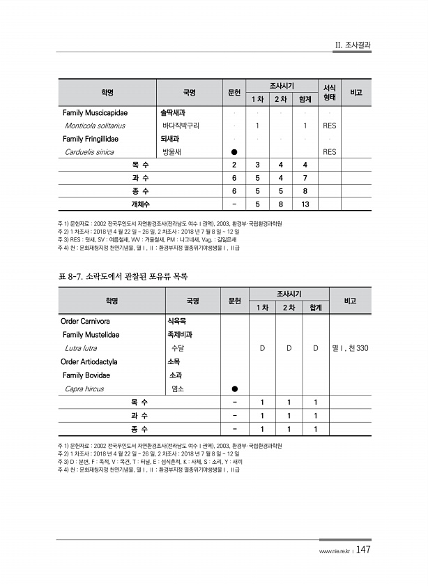 II. 조사결과 www.nie.re.kr ?147 주 1 문헌자료 2002 전국무인도서 자연환경조사 전라남도 여수Ⅰ권역 , 2003, 환경부·국립환경과학원 주 2 1 차조사 2018 년 4 월 22 일 26 일, 2 차조사 2018 년 7 월 8 일 12 일 주 3 RES 텃새, SV 여름철새, WV 겨울철새, PM 나그네새, Vag. 길잃은새 주 4 천 문화재청지정 천연기념물, 멸Ⅰ, Ⅱ 환경부지정 멸종위기야생생물Ⅰ, Ⅱ급 학명 국명 문헌 조사시기 비고 1 차 2 차 합계 Order Carnivora 식육목 Family Mustelidae 족제비과 Lutra lutra 수달 D D D 멸Ⅰ, 천 330 Order Artiodactyla 소목 Family Bovidae 소과 Capra hircus 염소 ● ...