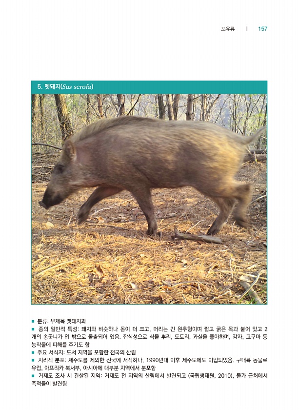 포유류 ┃ 157 5. 멧돼지 Sus scrofa ■ 분류우제목 멧돼지과 ■ 종의 일반적 특성돼지와 비슷하나 몸이 더 크고, 머리는 긴 원추형이며 짧고 굵은 목과 붙어 있고 2 개의 송곳니가 입 밖으로 돌출되어 있음. 잡식성으로 식물 뿌리, 도토리, 과실을 좋아하며, 감자, 고구마 등 농작물에 피해를 주기도 함 ■ 주요 서식지도서 지역을 포함한 전국의 산림 ■ 지리적 분포제주도를 제외한 전국에 서식하나, 1990년대 이후 제주도에도 이입되었음. 구대륙 동물로 유럽, 아프리카 북서부, 아시아에 대부분 지역에서 분포함 ■ 거제도 조사 시 관찰된 지역거제도 전 지역의 산림에서 발견되고 국립생태원, 2010 , 물가 근처에서 족적들이발견됨
