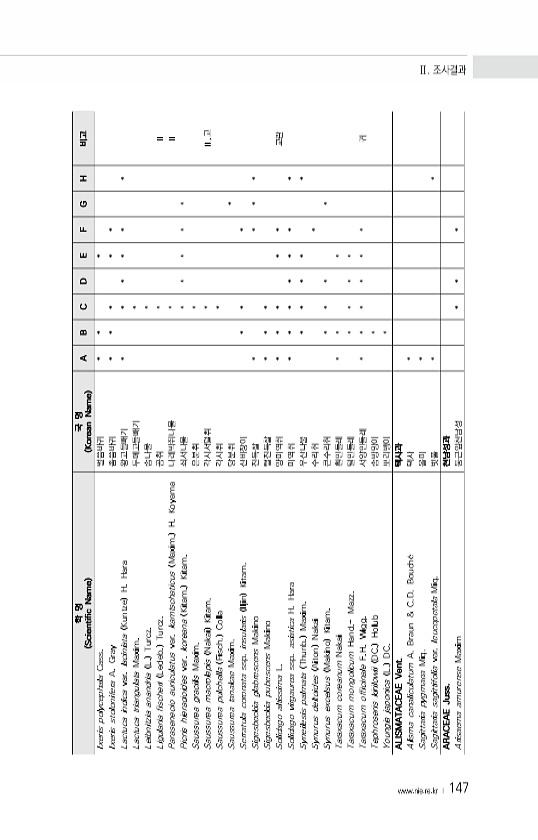 www ·nie·re·kr ? 147 학 명 Scientific Name 국 명 Korean Name A B C D E F G H 비고 Ixeris polycephala Cass. 벌씀바귀 * * * Ixeris stolonifera A. Gray 좀씀바귀 * * * * * Lactuca indica var. laciniata Kuntze H. Hara 왕고들빼기 * * * * * * Lactuca triangulata Maxim. 두메고들빼기 * Leibnitzia anandria L. Turcz. 솜나물 * Ligularia fischeri Ledeb. Turcz. 곰취 * Ⅱ Parasenecio auriculatus var. kamtschaticus Maxim. H. Koyama 나래박쥐나물 * Ⅱ ...