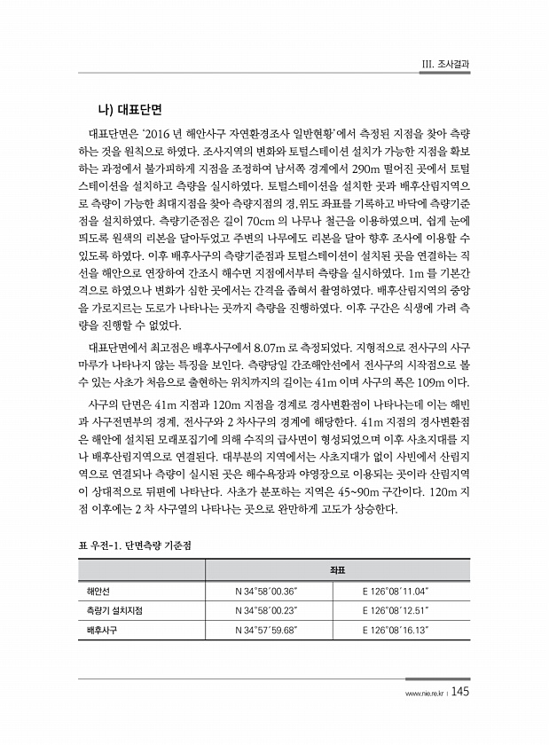 III. 조사결과 www.nie.re.kr ?145 대표단면은 ‘2016 년 해안사구 자연환경조사 일반현황’에서 측정된 지점을 찾아 측량 하는 것을 원칙으로 하였다. 조사지역의 변화와 토털스테이션 설치가 가능한 지점을 확보 하는 과정에서 불가피하게 지점을 조정하여 남서쪽 경계에서 290m 떨어진 곳에서 토털 스테이션을 설치하고 측량을 실시하였다. 토털스테이션을 설치한 곳과 배후산림지역으 로 측량이 가능한 최대지점을 찾아 측량지점의 경,위도 좌표를 기록하고 바닥에 측량기준 점을 설치하였다. 측량기준점은 길이 70cm 의 나무나 철근을 이용하였으며, 쉽게 눈에 띄도록 원색의 리본을 달아두었고 주변의 나무에도 리본을 달아 향후 조사에 이용할 수 있도록 하였다. 이후 배후사구의 측량기준점과 토털스테이션이 설치된 곳...