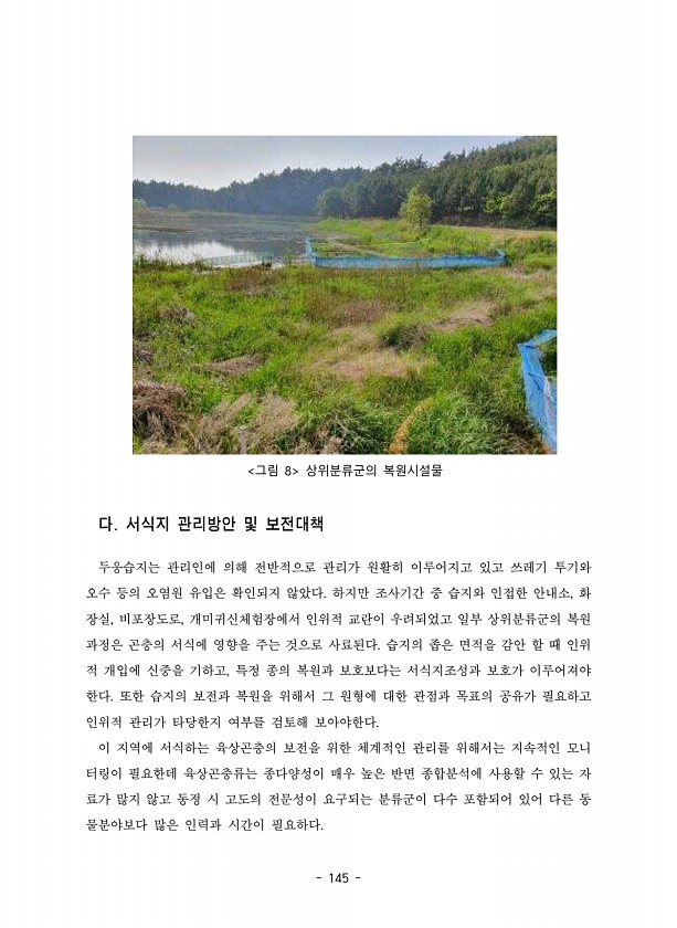 145 그림 8 상위분류군의 복원시설물 다. 서식지 관리방안 및 보전대책 두웅습지는 관리인에 의해 전반적으로 관리가 원활히 이루어지고 있고 쓰레기 투기와 오수 등의 오염원 유입은 확인되지 않았다. 하지만 조사기간 중 습지와 인접한 안내소, 화 장실, 비포장도로, 개미귀신체험장에서 인위적 교란이 우려되었고 일부 상위분류군의 복원 과정은 곤충의 서식에 영향을 주는 것으로 사료된다. 습지의 좁은 면적을 감안 할 때 인위 적 개입에 신중을 기하고, 특정 종의 복원과 보호보다는 서식지조성과 보호가 이루어져야 한다. 또한 습지의 보전과 복원을 위해서 그 원형에 대한 관점과 목표의 공유가 필요하고 인위적 관리가 타당한지 여부를 검토해 보아야한다. 이 지역에 서식하는 육상곤충의 보전을 위한 체계적인 관리를 위해서는 지속적...