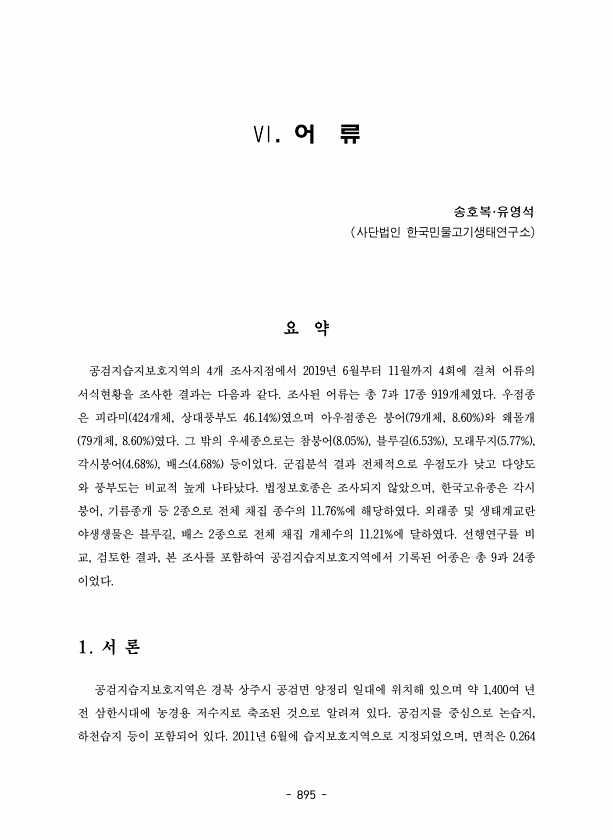 895 Ⅵ. 어 류 송호복·유영석 사단법인 한국민물고기생태연구소 요 약 공검지습지보호지역의 4개 조사지점에서 2019년 6월부터 11월까지 4회에 걸쳐 어류의 서식현황을 조사한 결과는 다음과 같다. 조사된 어류는 총 7과 17종 919개체였다. 우점종 은 피라미 424개체, 상대풍부도 46.14% 였으며 아우점종은 붕어 79개체, 8.60% 와 왜몰개 79개체, 8.60% 였다. 그 밖의 우세종으로는 참붕어 8.05% , 블루길 6.53% , 모래무지 5.77% , 각시붕어 4.68% , 배스 4.68% 등이었다. 군집분석 결과 전체적으로 우점도가 낮고 다양도 와 풍부도는 비교적 높게 나타났다. 법정보호종은 조사되지 않았으며, 한국고유종은 각시 붕어, 기름종개 등 2종으로 전체 채집 종수의 11.76%에 해...
