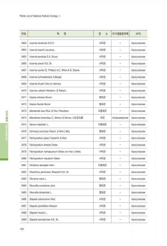 156 번호 학 명 장 소 국가생물종목록 APG 피자식물문 Magnoliophyta Plants List of National Institute Ecology Ⅰ 3463 Huernia keniensis R.E.Fr. 사막관 Apocynaceae 3464 Huernia leachii Lavranos 사막관 Apocynaceae 3465 Huernia pendula E.A. Bruce 사막관 Apocynaceae 3466 Huernia piersii N.E. Br. 사막관 Apocynaceae 3467 Huernia quinta E. Phillips A.C. White & B. Sloane 사막관 Apocynaceae 3468 Huernia schneideriana A.Berger 사막관 Apocynaceae...