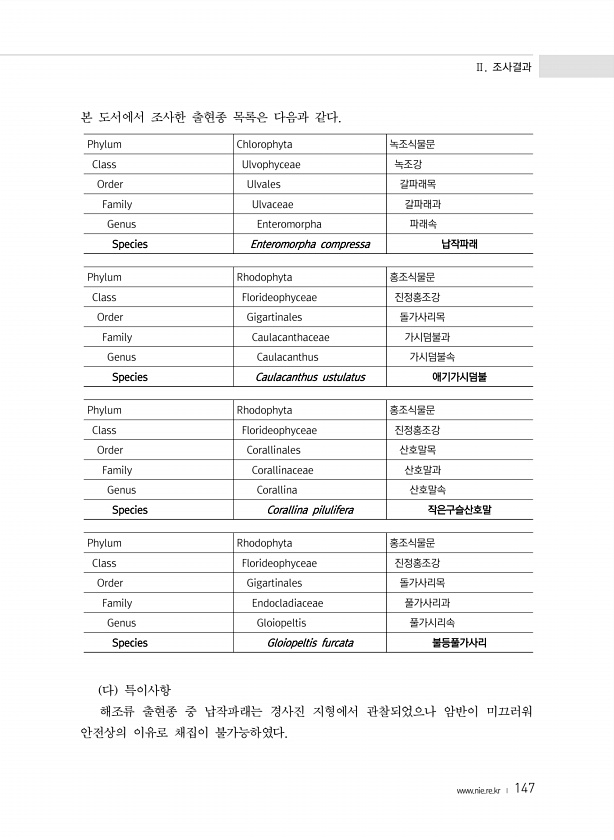 Ⅱ. 조사결과 www.nie.re.kr ? 147 본 도서에서 조사한 출현종 목록은 다음과 같다. Phylum Chlorophyta 녹조식물문 Class Ulvophyceae 녹조강 Order Ulvales 갈파래목 Family Ulvaceae 갈파래과 Genus Enteromorpha 파래속 Species Enteromorpha compressa 납작파래 Phylum Rhodophyta 홍조식물문 Class Florideophyceae 진정홍조강 Order Gigartinales 돌가사리목 Family Caulacanthaceae 가시덤불과 Genus Caulacanthus 가시덤불속 Species Caulacanthus ustulatus 애기가시덤불 Phylum Rhodophyta 홍조식물문 Class ...