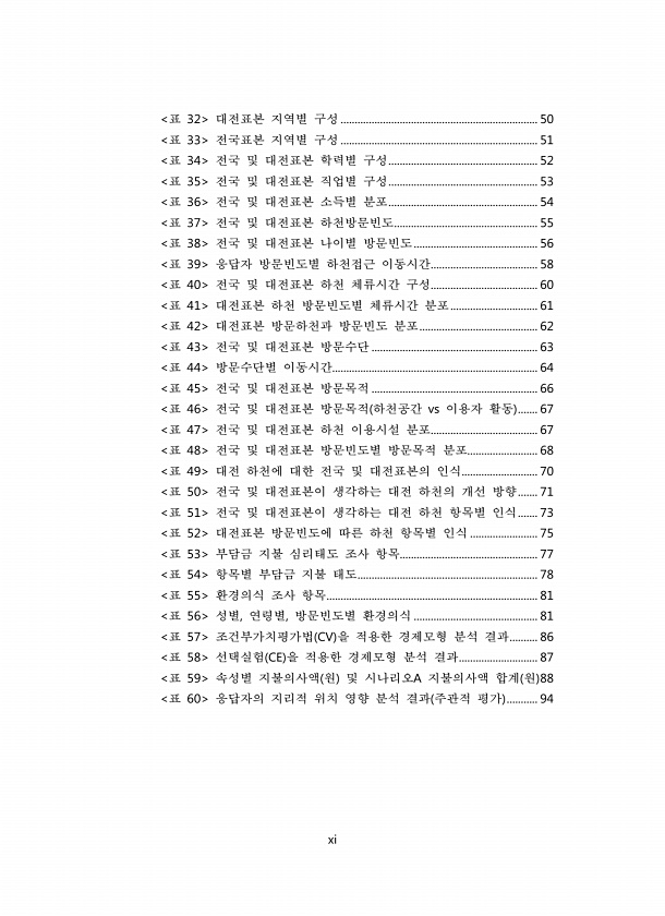 xi 표 32 대전표본 지역별 구성...................................................................... 50 표 33 전국표본 지역별 구성...................................................................... 51 표 34 전국 및 대전표본 학력별 구성..................................................... 52 표 35 전국 및 대전표본 직업별 구성..................................................... 53 표 36 전국 및 대전표본 소득별 분포...........................................