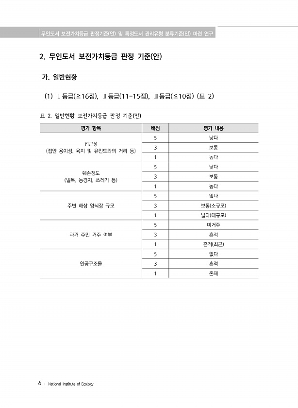 무인도서 보전가치등급 판정기준 안 및 특정도서 관리유형 분류기준 안 마련 연구 6 ? National Institute of Ecology 2. 무인도서 보전가치등급 판정 기준 안 가. 일반현황 1 Ⅰ등급 ≥16점 , Ⅱ등급 11-15점 , Ⅲ등급 ≤10점 표 2 평가 항목 배점 평가 내용 접근성 접안 용이성, 육지 및 유인도와의 거리 등 5 낮다 3 보통 1 높다 훼손정도 벌목, 농경지, 쓰레기 등 5 낮다 3 보통 1 높다 주변 해상 양식장 규모 5 없다 3 보통 소규모 1 넓다 대규모 과거 주민 거주 여부 5 미거주 3 흔적 1 흔적 최근 인공구조물 5 없다 3 흔적 1 존재 표 2. 일반현황 보전가치등급 판정 기준 안