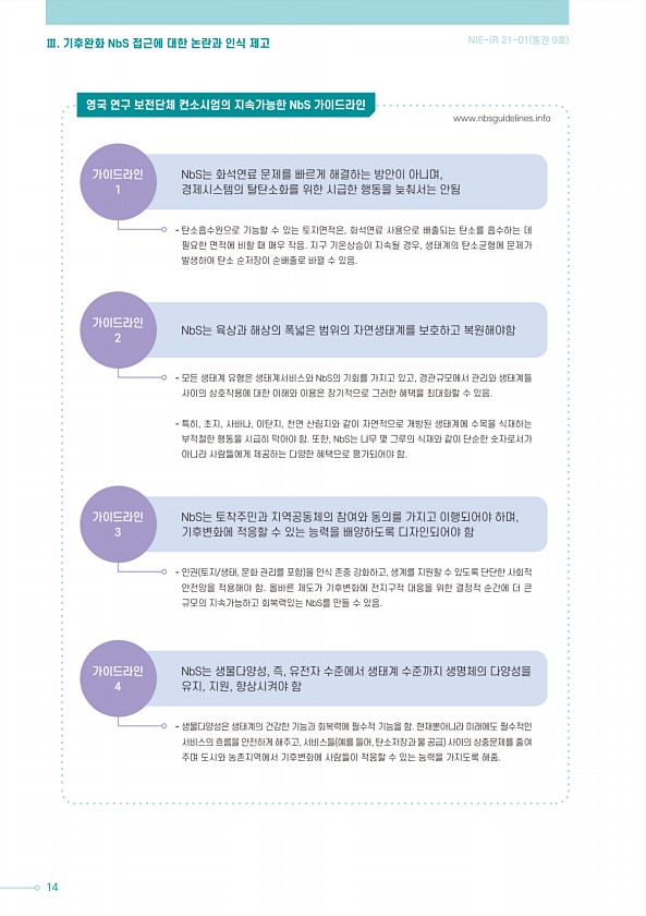 14 NIE-IR 21-01 통권 9호 영국 연구?보전단체 컨소시엄의 지속가능한 NbS 가이드라인 www.nbsguidelines.info NbS는 화석연료 문제를 빠르게 해결하는 방안이 아니며, 경제시스템의 탈탄소화를 위한 시급한 행동을 늦춰서는 안됨 NbS는 육상과 해상의 폭넓은 범위의 자연생태계를 보호하고 복원해야함 NbS는 토착주민과 지역공동체의 참여와 동의를 가지고 이행되어야 하며, 기후변화에 적응할 수 있는 능력을 배양하도록 디자인되어야 함 NbS는 생물다양성, 즉, 유전자 수준에서 생태계 수준까지 생명체의 다양성을 유지, 지원, 향상시켜야 함 탄소흡수원으로 기능할 수 있는 토지면적은, 화석연료 사용으로 배출되는 탄소를 흡수하는 데 필요한 면적에 비할 때 매우 작음. 지구 기온상승이 지속될 경우,...