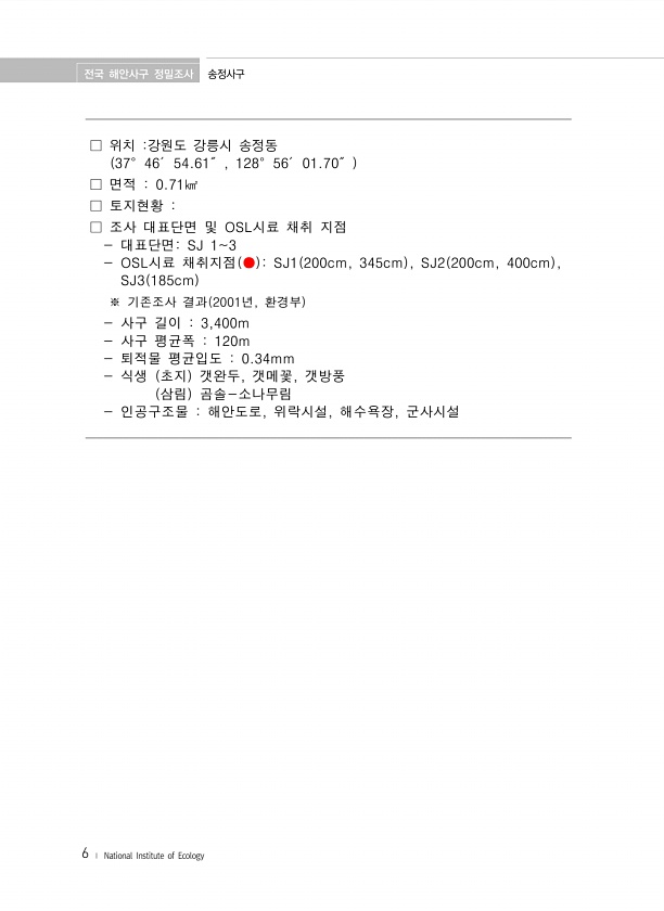 전국 해안사구 정밀조사 송정사구 6 ? National Institute of Ecology □ 위치 강원도 강릉시 송정동 37°46′54.61″, 128°56′01.70″ □ 면적 0.71㎢ □ 토지현황 □ 조사 대표단면 및 OSL시료 채취 지점 대표단면SJ 13 OSL시료 채취지점 ● SJ1 200cm, 345cm , SJ2 200cm, 400cm , SJ3 185cm ※ 기존조사 결과 2001년, 환경부 사구 길이 3,400m 사구 평균폭 120m 퇴적물 평균입도 0.34mm 식생 초지 갯완두, 갯메꽃, 갯방풍 삼림 곰솔-소나무림 인공구조물 해안도로, 위락시설, 해수욕장,군사시설