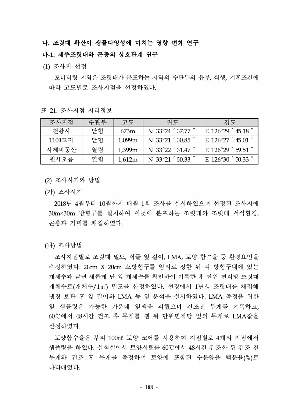 108 조사지점 수관부 고도 위도 경도 천왕사 닫힘 673m N 33°24′37.77″ E 126°29′45.18″ 1100고지 닫힘 1,099m N 33°21′30.85″ E 126°27′45.01″ 사제비동산 열림 1,399m N 33°22′31.47″ E 126°29′59.51″ 윗세오름 열림 1,612m N 33°21′50.33″ E 126°30′50.33″ 표 21. 조사지점 지리정보 나. 조릿대 확산이 생물다양성에 미치는 영향 변화 연구 나-1. 제주조릿대와 곤충의 상호관계 연구 1 조사지 선정 모니터링 지역은 조릿대가 분포하는 지역의 수관부의 유무, 식생, 기후조건에 따라 고도별로 조사지점을 선정하였다. 2 조사시기와 방법 가 조사시기 2018년 4월부터 10월까지 매월 1회 조사를 실시하였으며...