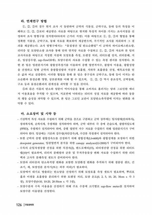 라 연계연구 방법 ①, ②, ③의 경우 현지 조사 시 동반하여 군락의 식물상, 군락구조, 동태 등의 특징을 이 해하고 ①, ②, ③로터 제공받은 자료를 바탕으로 현저한 특징적 차이를 가지는 조사지점을 선 정하여 조사 방형구를 설치한다 타워의 근거리 지점 이를 바탕으로 ①, ②, ③의 협업을 통해 정확한 식물상, 군락구조, 동태 자료를 확보하여 제공받으며, 주기적인 조사를 의뢰하여 그 결 과를 제공받는다. 조사 방형구에서는 “물질생산 및 탄소순환팀” 이 군락의 바이오메스탄소량, 리터층 및 토양탄소량 조사를 통해 단위 면적당 자료를 수집하고 ①, ②, ③의 자료와 본 팀의 조사자료를 바탕으로 적정한 지점에 토양호흡 측정, 트렌칭 처리, 리터트랩 설치, 리터분해, 지 온, 임상강우량, sap-flow 10개 , ...