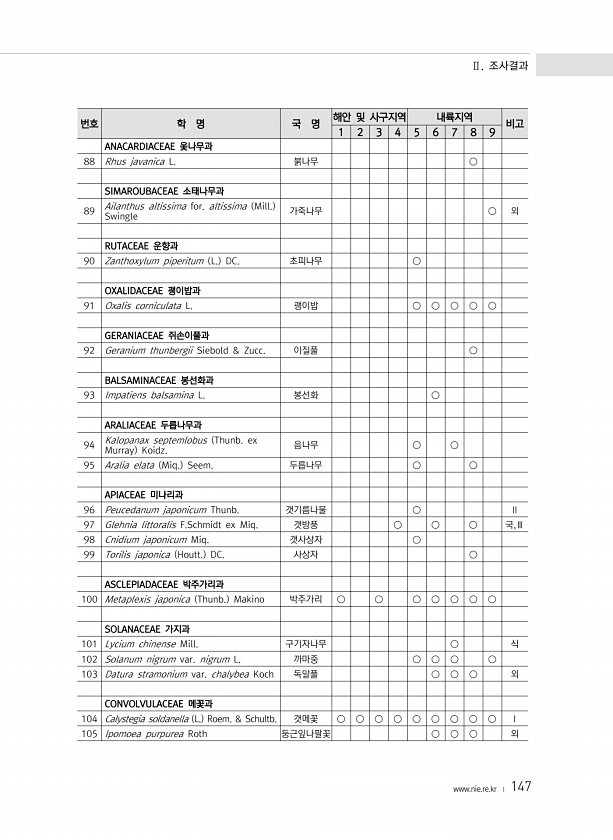 Ⅱ. 조사결과 www.nie.re.kr ? 147 번호 학 명 국 명 해안 및 사구지역 내륙지역 비고 1 2 3 4 5 6 7 8 9 ANACARDIACEAE 옻나무과 88 Rhus javanica L. 붉나무 ○ SIMAROUBACEAE 소태나무과 89 Ailanthus altissima for. altissima Mill. Swingle 가죽나무 ○ 외 RUTACEAE 운향과 90 Zanthoxylum piperitum L. DC. 초피나무 ○ OXALIDACEAE 괭이밥과 91 Oxalis corniculata L. 괭이밥 ○ ○ ○ ○ ○ GERANIACEAE 쥐손이풀과 92 Geranium thunbergii Siebold & Zucc. 이질풀 ○ BALSAMINACEAE 봉선화과 93 Impati...