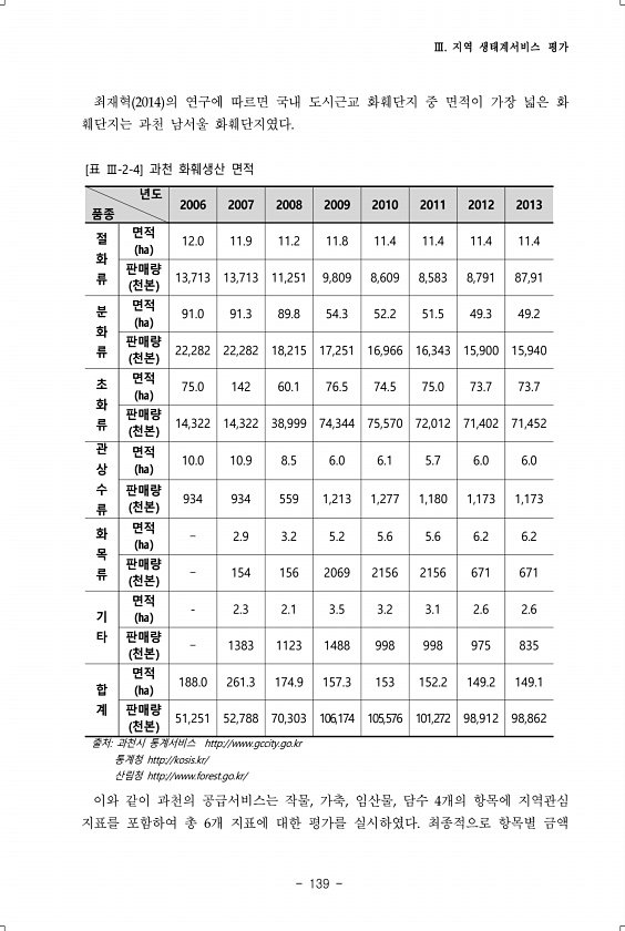 Ⅲ. 지역 생태계서비스 평가 139 최재혁 2014 의 연구에 따르면 국내 도시근교 화훼단지 중 면적이 가장 넓은 화 훼단지는 과천 남서울 화훼단지였다. 년도 품종 2006 2007 2008 2009 2010 2011 2012 2013 절 화 류 면적 ㏊ 12.0 11.9 11.2 11.8 11.4 11.4 11.4 11.4 판매량 천본 13,713 13,713 11,251 9,809 8,609 8,583 8,791 87,91 분 화 류 면적 ㏊ 91.0 91.3 89.8 54.3 52.2 51.5 49.3 49.2 판매량 천본 22,282 22,282 18,215 17,251 16,966 16,343 15,900 15,940 초 화 류 면적 ㏊ 75.0 142 60.1 76.5 74.5 75.0 73.7 ...