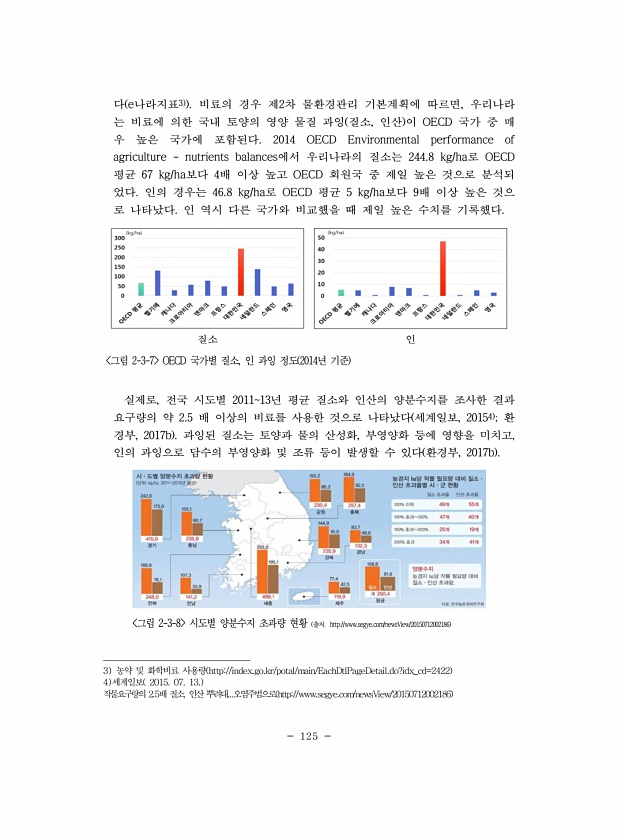 125 다 e나라지표3 비료의 경우 제2차 물환경관리 기본계획에 따르면, 우리나라 는 비료에 의한 국내 토양의 영양 물질 과잉 질소, 인산 이 OECD 국가 중 매 우 높은 국가에 포함된다. 2014 OECD Environmental performance of agriculture nutrients balances에서 우리나라의 질소는 244.8 kg/ha로 OECD 평균 67 kg/ha보다 4배 이상 높고 OECD 회원국 중 제일 높은 것으로 분석되 었다. 인의 경우는 46.8 kg/ha로 OECD 평균 5 kg/ha보다 9배 이상 높은 것으 로 나타났다. 인 역시 다른 국가와 비교했을 때 제일 높은 수치를 기록했다. 질소 인 그림 2-3-7 OECD 국가별 질소, 인 과잉 정도 2014년 기준 실제로, ...