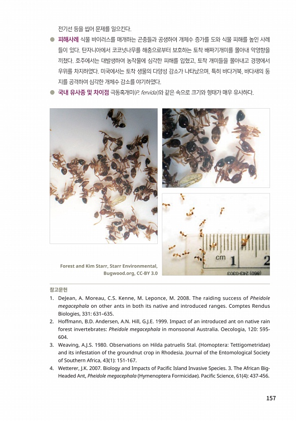 157 전기선 등을 씹어 문제를 일으킨다. ● 피해사례 식물 바이러스를 매개하는 곤충들과 공생하여 개체수 증가를 도와 식물 피해를 높인 사례 들이 있다. 탄자니아에서 코코넛나무를 해충으로부터 보호하는 토착 배짜기개미를 몰아내 악영향을 끼쳤다. 호주에서는 대발생하여 농작물에 심각한 피해를 입혔고, 토착 개미들을 몰아내고 경쟁에서 우위를 차지하였다. 미국에서는 토착 생물의 다양성 감소가 나타났으며, 특히 바다거북, 바다새의 둥 지를 공격하여 심각한 개체수 감소를 야기하였다. ● 국내 유사종 및 차이점 극동혹개미 P. fervida 와 같은 속으로 크기와 형태가 매우 유사하다. 참고문헌 1. DeJean, A. Moreau, C.S. Kenne, M. Leponce, M. 2008. The raiding succ...